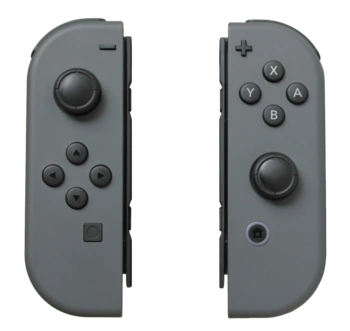 Los Joy-Con son los principales controladores de la consola Nintendo Switch. Consisten en dos unidades individuales, cada uno que contiene un palillo análogo y una matriz de botones. Pueden utilizarse mientras están conectados a la unidad principal de la consola Nintendo Switch, o separados y utilizados de forma inalámbrica; Cuando se separan, un par de Joy-Con pueden ser utilizados por un solo jugador, o dividido entre dos como controladores individuales.