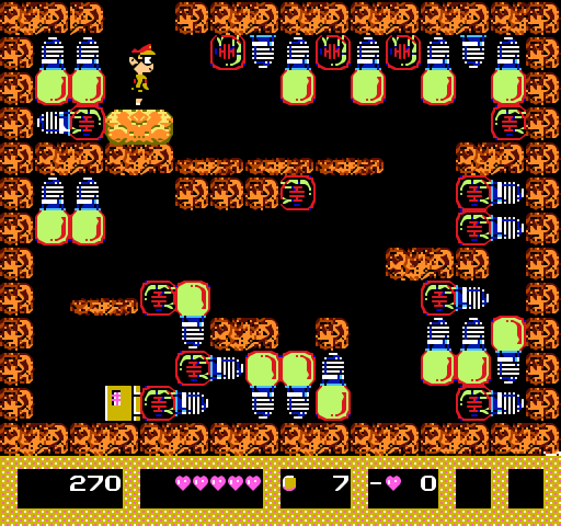 El juego cuenta con un sistema de continuaciones inusual y poco efectivo, pero que resulta en la única manera de seguir jugando tras perder una vida. En primer lugar, hay que conseguir un ítem secreto escondido en una complicada cueva en el primer nivel para ganar la posibilidad de continuar. Luego, al morir, Kiteretsu aparece en el mismo infierno en donde el rey Enma lo recibe y le pregunta con cuantos corazones desea revivir. El jugador dispone de nueve corazones que puede usar para regresar a la vida, pero una vez que los gasta a todos ya no podrá revivir y el juego termina. Por ejemplo, si el jugador elige revivir con cuatro corazones, luego, al morir podrá volver a revivir con hasta cinco; o de lo contrario, puede escoger revivir con nueve corazones (el máximo de salud) pero luego ya no podrá resucitar si pierde.