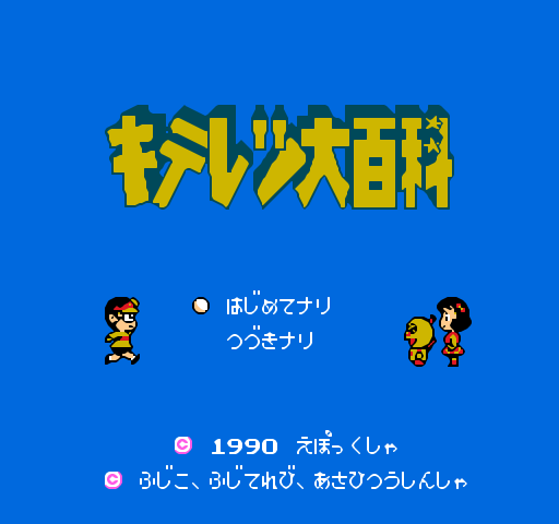 Kiteretsu Daihyakka está basado en una popular serie de manga y anime del mismo nombre, conocida en España como "Kiteretsu, el primo más listo de Nobita".[3] Este es un videojuego de NES lanzado en 1990, muy típico de su época, utiliza el estilo de juego de Super Mario Bros., que fue el gran referente de los videojuegos de plataformas de 8 bits.