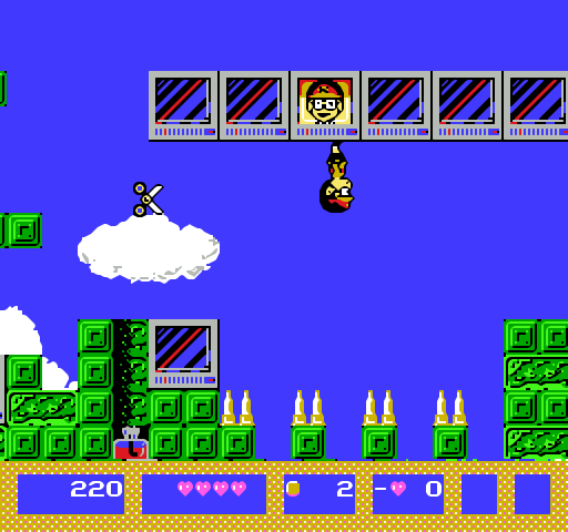 La vida de Kiteretsu se mide en puntos de vida representados por corazones. Kiteretsu inicia el juego con cinco corazones, pero puede sumar hasta nueve, al recoger ítems de corazones. Cuando sufre daño, Kiteretsu pierde un corazón, y si se cae a un precipicio pierde dos corazones y debe reiniciar la pantalla. Cuando se queda sin corazones pierde la vida, y esto resulta fatal debido a que en este juego hay una única vida, sin posibilidad de sumar más. Por este motivo, resulta fundamental conservar los corazones y tratar de recibir el menor daño posible.