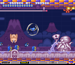Pentarou combate a los pingüinos enemigos en Gokujou Parodius Da! Deluxe Pack.